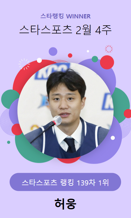 1위는 프로농구(KBL) 스타 허웅(32·부산 KCC)이 139주 연속 지켜냈다. 9401표를 얻어 2022년 6월 30일 스타랭킹에 스포츠 부문이 추가된 이래 단 한 번도 정상을 놓치지 않았다.