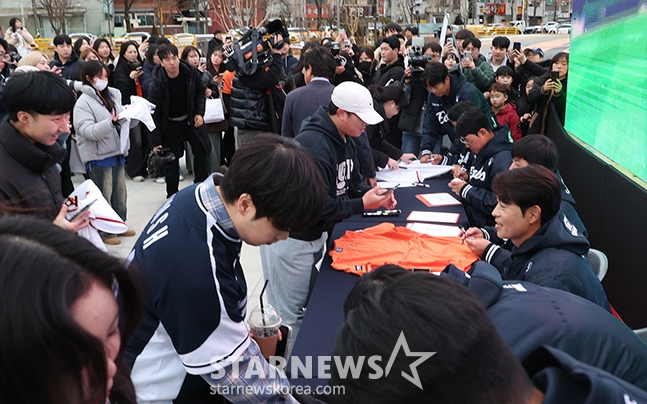 문동주를 비롯한 한화 선수들이 팬사인회에서 팬들과 소통하고 있다.