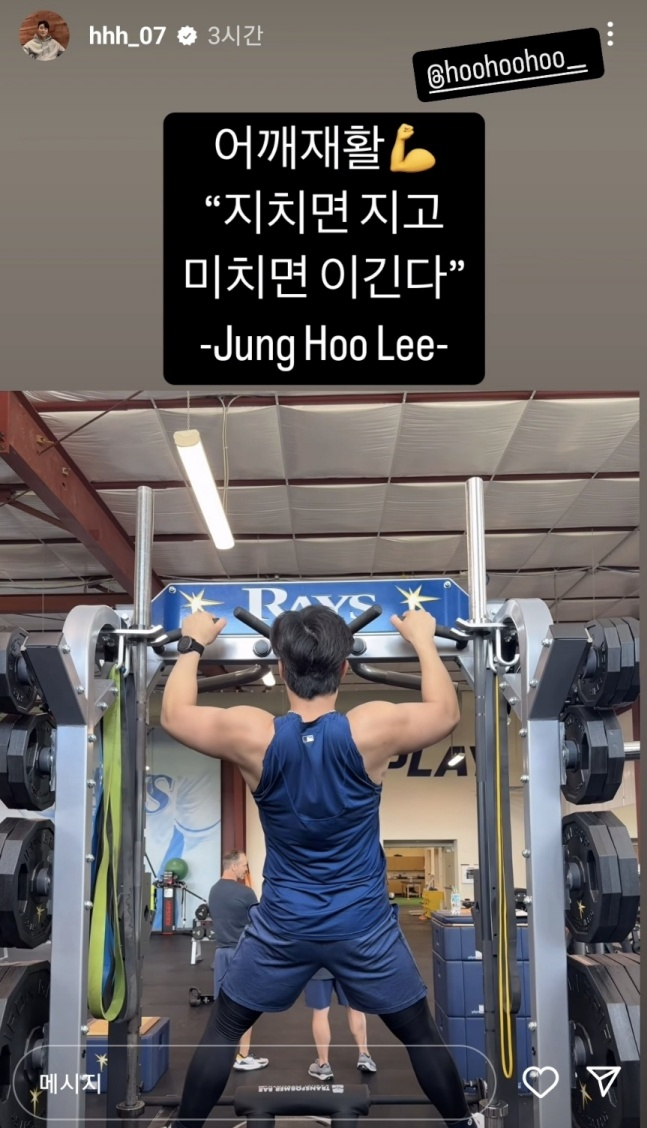 김하성은 5일(한국시간) 자신의 SNS에 히어로즈 후배 이정후(27·샌프란시스코 자이언츠)의 계정을 태그한 뒤 "어깨 재활, 지치면 지고, 미치면 이긴다"는 문구와 함께 등 운동을 하는 사진을 공개했다.