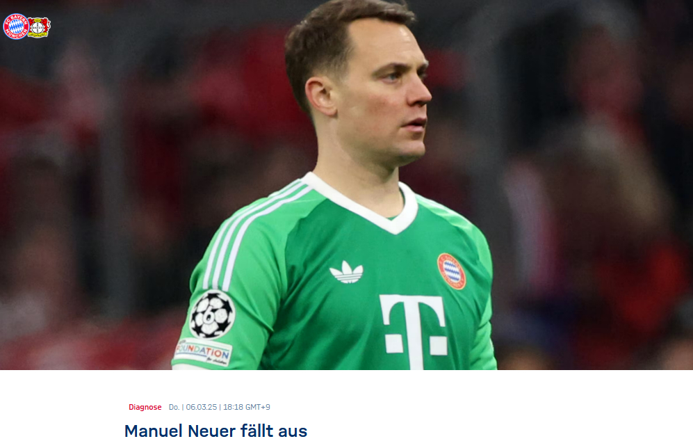 올 시즌 독일과 유럽 제패를 노리는 뮌헨은 바이어 레버쿠젠(독일)과 유럽축구연맹(UEFA) 챔피언스리그(UCL) 16강 1차전 대승에도 마냥 웃을 수 없게 됐다. 뮌헨은 홈구장인 알리안츠 아레나에서 3-0 승리를 거두며 8강행 유리한 고지를 선점했다. 하지만 핵심 전력 노이어를 잃으며 향후 우승 도전에 빨간불이 켜졌다.