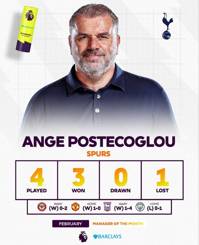 올 시즌 극심한 부진을 겪는 토트넘이지만 2월 성적은 나쁘지 않았다. 3승1패를 기록했다. 토트넘은 브렌트포드를 2-0으로 꺾은 뒤 맨체스터 유나이티드를 상대로도 1-0으로 이겼다. 입스위치는 4-1로 잡아냈다. 직전 맨체스터 시티전에서 0-1로 패해 2월 전승에는 실패했지만, 이달의 감독 후보에 오르기엔 문제없는 성적이었다.