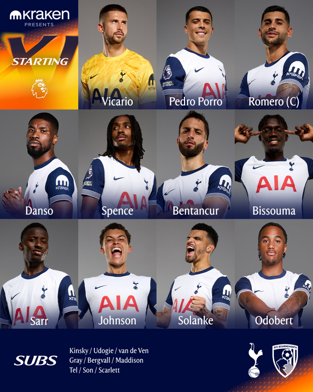 대신 토트넘은 본머스전에서 도미닉 솔란케, 윌슨 오도베르, 브레넌 존슨을 스리톱에 배치한다. 마타 파페 사르, 이브 비수마, 로드리고 벤탄쿠르가 중원을 구성한다. 제드 스펜스, 크리스티안 로메로, 케빈 단소, 페드로 포로가 포백을 책임진다. 골문은 굴리에모 비카리오가 지킨다.