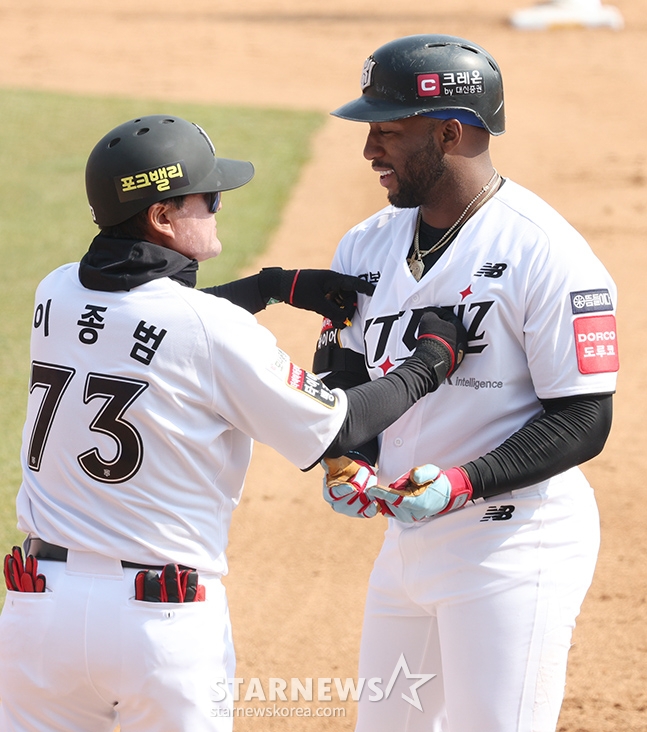스포츠야구[포토] 로하스 '럭키비키 찌찌뽕'발행 : 2025.03.10 ・ 14:53조회수 :수정 : 2025.03.10 ・ 16:21수원=김진경 대기자2025 신한 SOL Bank KBO리그 시범경기 kt 위즈 대 키움 히어로즈 경기가 10일 수원KT위즈파크에서 열렸다.kt 로하스가 4화말 무사 1루에서 행운의 우전 안타로 출루한 후 이종범 코치위 축하를 받고 있다.<저작권자 © 스타뉴스, 무단전재 및 재배포 금지>브리핑추천 기사김진경 대기자기자홈좋아요스포츠-야구의 인기 급상승 뉴스스포츠-야구의 최신 뉴스AD