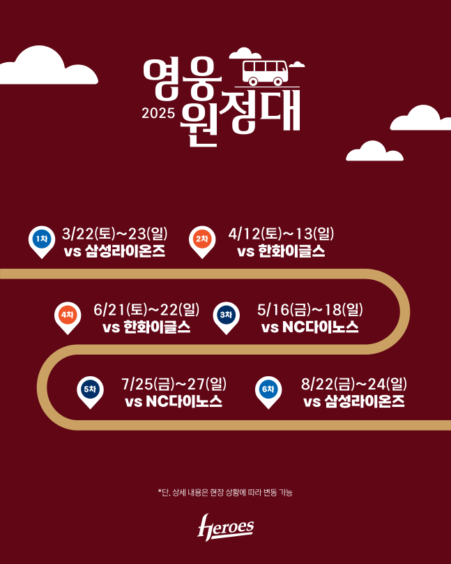 2025 영웅원정대는 삼성 라이온즈(대구), 한화 이글스(대전), NC 다이노스(창원)와의 원정경기에서 총 6회 진행할 예정이다. 경기 관람뿐만 아니라 다양한 특별 프로그램이 포함된다.