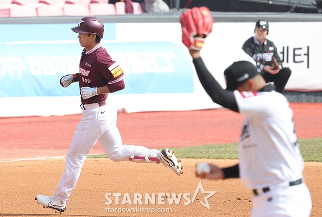 키움 이주형이 3회초 1사에서 KT 선발 쿠에바스를 상대로 역전 우월 1점 홈런을 날린 후 다이아몬드를 돌고 있다.