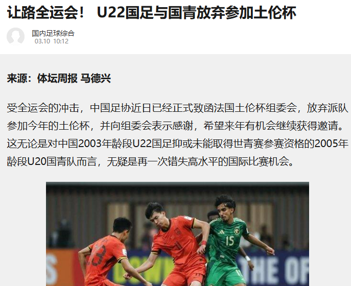 중국 매체 '시나스포츠'는 11일(한국시간) "CFA는 최근 프랑스 툴롱 토너먼트 조직위원회에 공식 서한을 보내 중국 대표팀의 불참 의사를 밝혔다"며 "이번 대회 불참 이유로 CFA는 전국 대회의 중요성을 강조했다"고 보도했다.