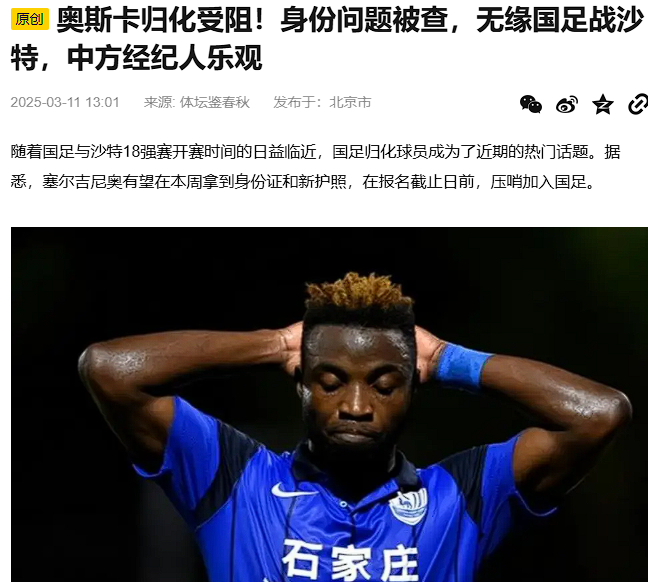 중국 매체 '소후닷컴'은 11일(한국시간) "중국 국가대표팀의 미래는 암울하다. 귀화를 원하는 선수의 꿈이 큰 타격을 입었다"며 "오스카는 중국 국가대표팀에 합류한다는 소문에 휩싸였지만, 최근 상황을 보면 심각한 어려움에 빠진 듯하다. 끝내 오스카는 사우디아라비아와 2026 국제축구연맹(FIFA) 북중미월드컵 3차 예선 경기를 뛰지 못할 것"이라고 보도했다.
