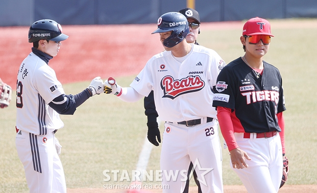 스포츠야구[포토] 강승호 '주자일소 2타점 3루타'발행 : 2025.03.14 ・ 14:30잠실=김진경 대기자광고삭제2025 신한 SOL Bank KBO리그 시범경기 두산 베어스 대 KIA 타이거즈 경기가 14일 잠실야구장에서 열렸다.두산 강승호가 4회말 무사 1,2루에서 주자일소 2타점 적시 3루타를 날리고 출루한 후 김동한 코치의 환영을 받고 있다.<저작권자 © 스타뉴스, 무단전재 및 재배포 금지>프로야구시범경기KBO김도영이범호이승엽추천 기사김진경 대기자기자홈좋아요 스포츠-야구의 인기 급상승 뉴스스포츠-야구의 최신 뉴스