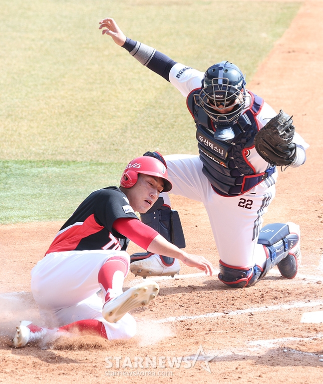 KIA 6회초 2사 2루에서 2루주자 서건창이 홍종표의 우전 안타 때 홈으로 뛰었으나 두산 포수 장승현에 태그아웃되고 있다.