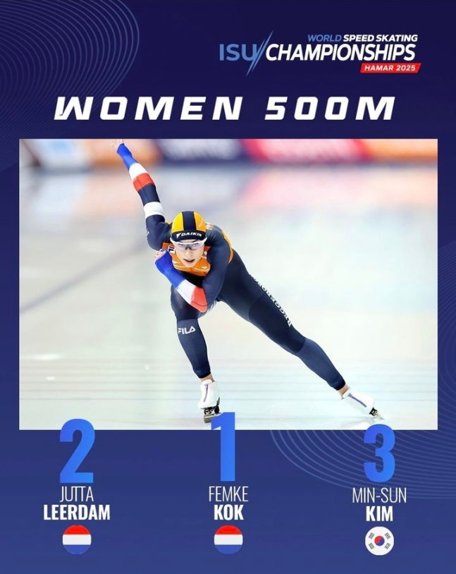 김민선은 15일(한국시간) 노르웨이 하마르 올림픽 홀에서 열린 2025 국제빙상경기연맹(ISU) 스피드스케이팅 종목별 세계선수권대회 여자 500m에서 37초73으로 결승선을 통과했다.