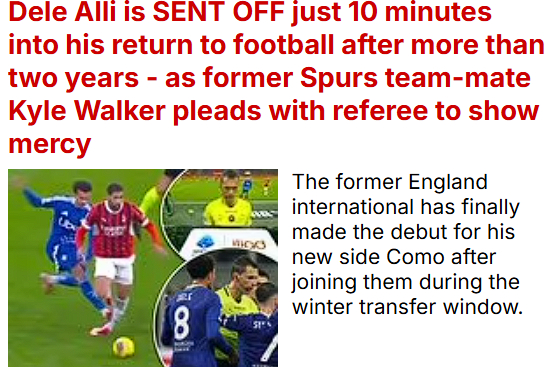 하지만 알리는 코모 복귀전에서 황당한 퇴장을 당하며 현지 여론의 뭇매를 맞고 있다. 토트넘 축구 천재의 몰락이 계속되는 분위기다.