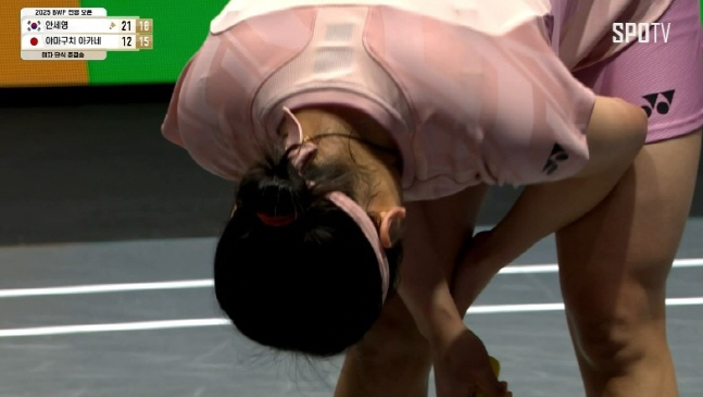 안세영의 발도 무거워졌다. 17-15에서 긴 랠리 끝에 야마구치의 실수로 득점한 이후 안세영은 허리를 숙이고 오른쪽 허벅지를 붙잡았다. 승리까지 한 점을 남겨두고 안세영은 연이은 실수를 범했다. 무릎을 꿇고 주저 않아 통증을 호소하기도 했다.