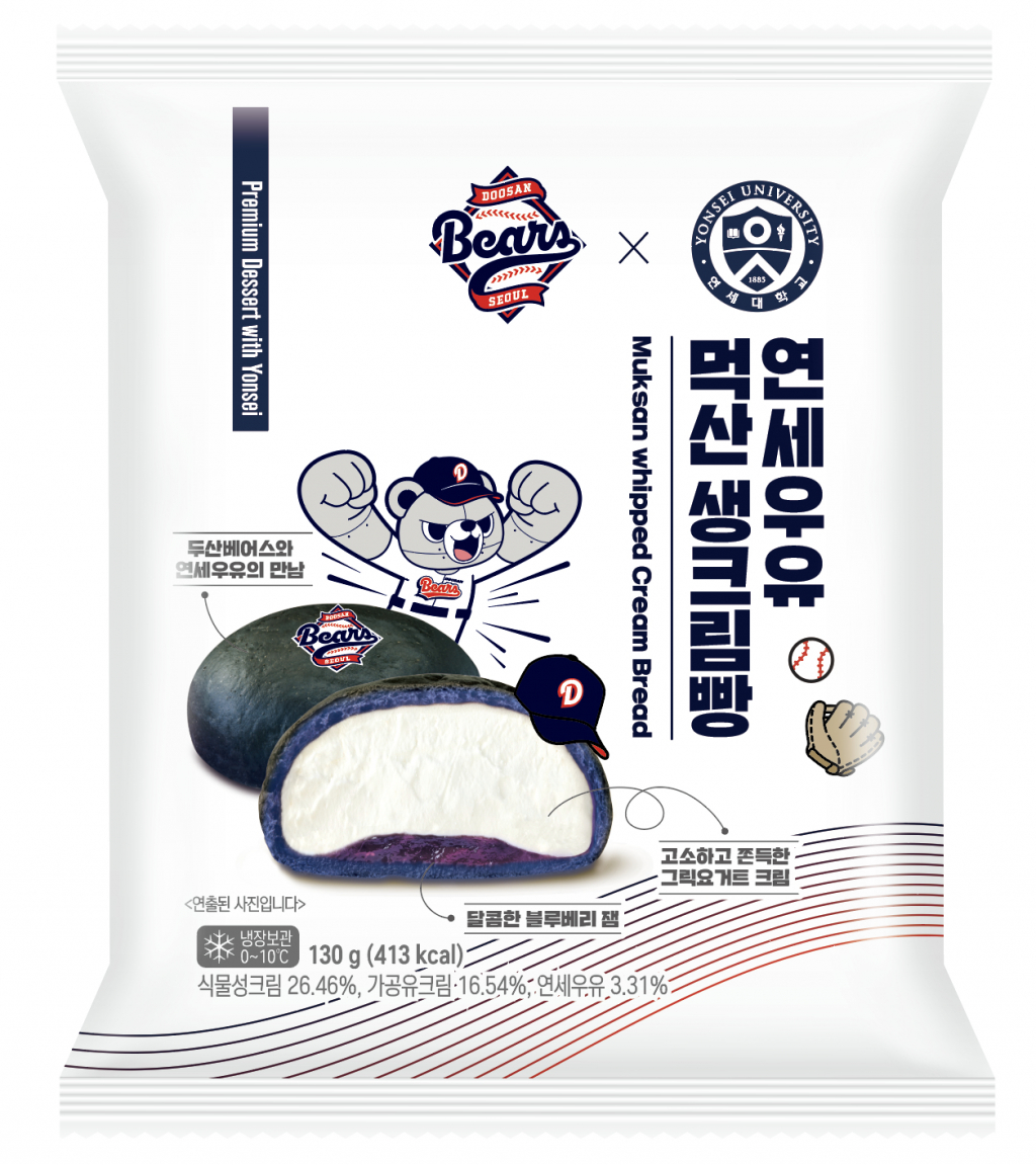 두산 베어스가 '연세대학교 연세유업'과 IP 콜라보를 진행, '연세우유 먹산 생크림빵'을 출시한다.