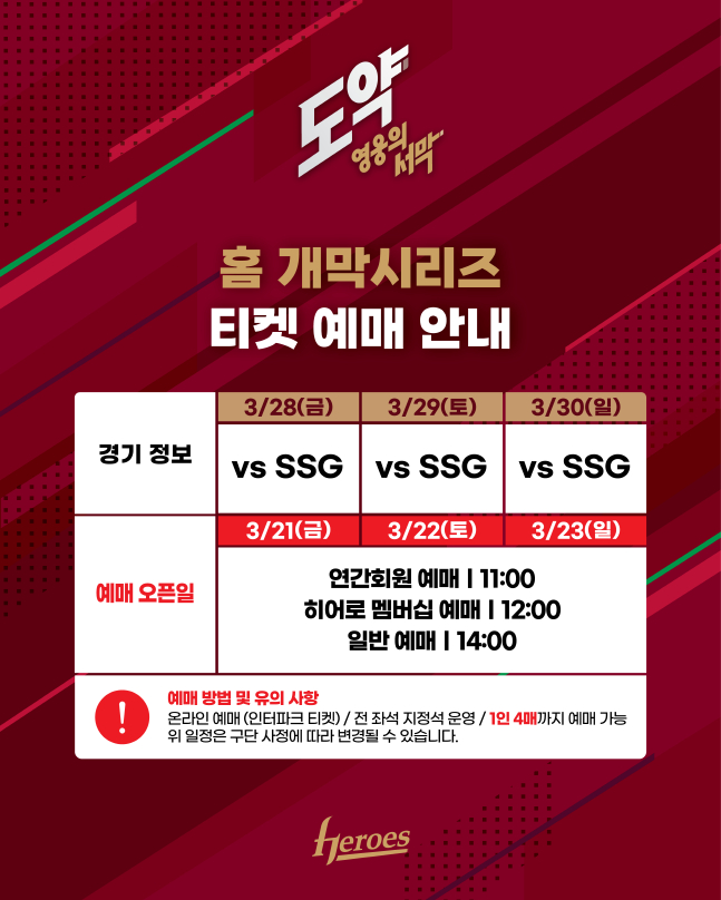 연간회원은 21일 오전 11시, 히어로 멤버십 회원은 정오 12시부터 예매할 수 있다. 일반판매는 오후 2시부터 시작한다.