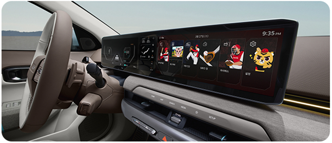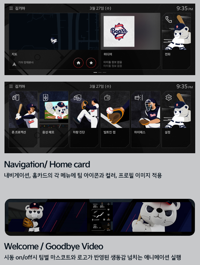 'KBO 디스플레이 테마'는 차량 내 대화면 ccNC(connected car Navigation Cockpit) 디스플레이의 색상 및 그래픽을 자신이 응원하는 구단에 맞게 커스터마이징할 수 있는 맞춤형 디지털 상품이다. ▲KBO 리그 소속 10개 구단의 팀 로고, 키컬러가 반영된 클러스터 ▲팀 마스코트와 유니폼을 착용한 선수 일러스트로 구성된 인포테인먼트 홈카드 및 프로필 ▲팀 마스코트가 내 차의 위치를 표시하는 내비게이션 등으로 구성된다.