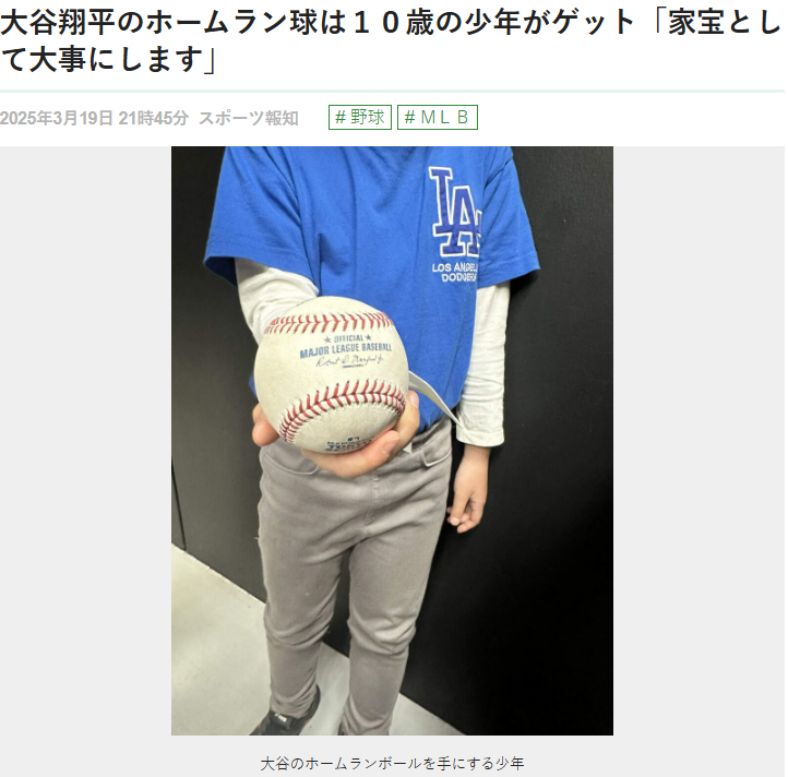 미국 프로야구 메이저리그(MLB) 슈퍼스타 오타니 쇼헤이(31·LA 다저스)가 2025시즌 1호 홈런을 터트렸다. 그리고 오타니의 홈런볼 주인공은 10세 소년이었다.