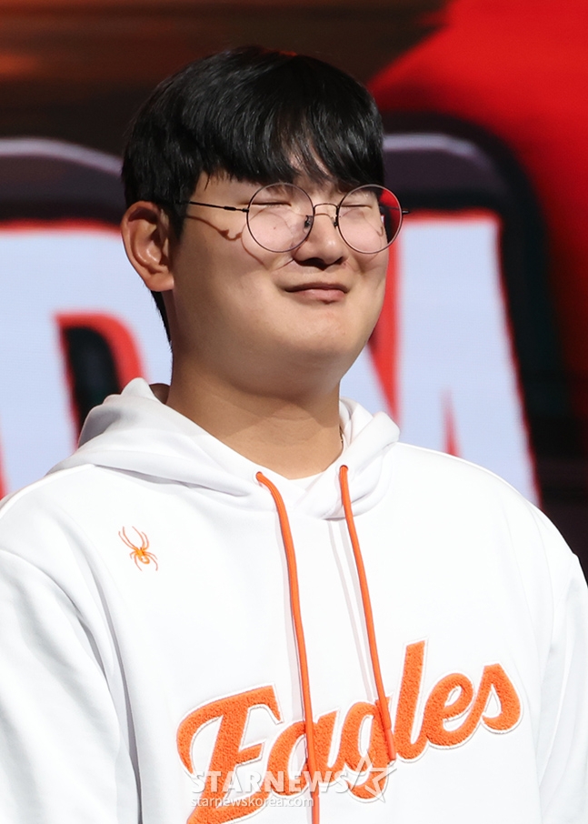 한화 김서현이 MC 요청에 잉크 포즈를 취하고 있다.