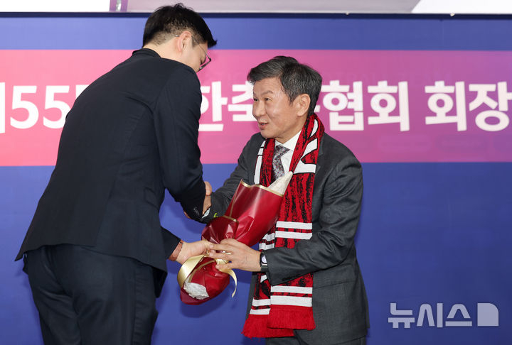 정몽규 대한축구협회장이 지난 2월 26일 서울 종로구 축구회관에서 열린 제55대 대한축구협회장 선거에서 당선 후 꽃다발을 받고 있다. /사진=뉴시스