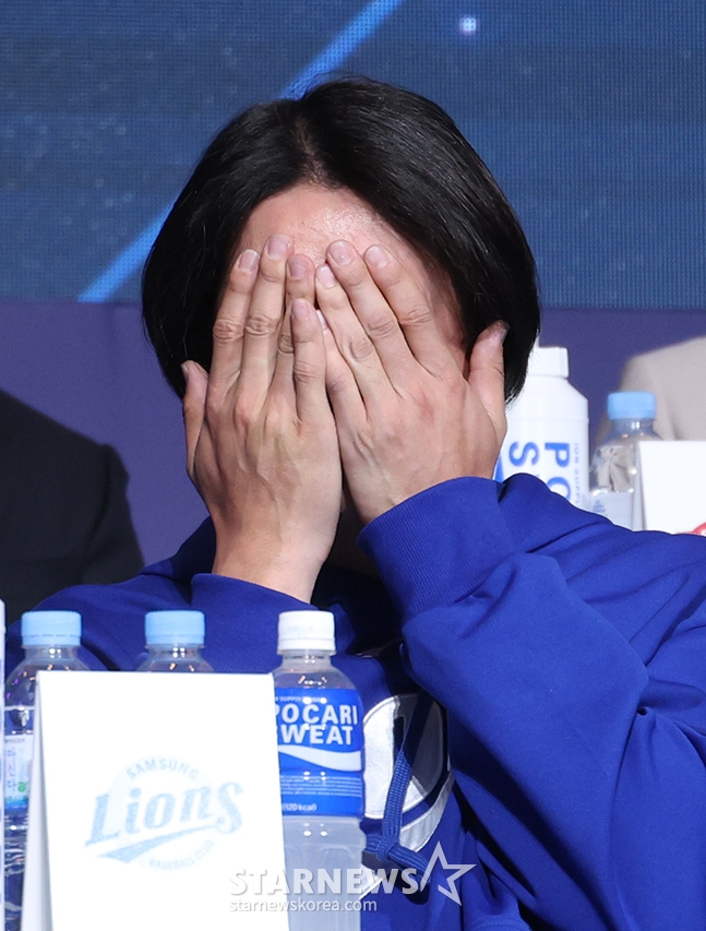 삼성 구자욱이 N행시를 발표한 후 부끄러워하고 있다.