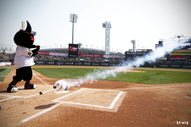 프로야구 KT 위즈가 올해도 개막전에서 전광판에서 홈플레이트까지 향하는 라인 로켓 시구로 만원 관중을 즐겁게 했다. 오직 수원에서만 즐길 수 있는 볼거리로 어느덧 10번째다.