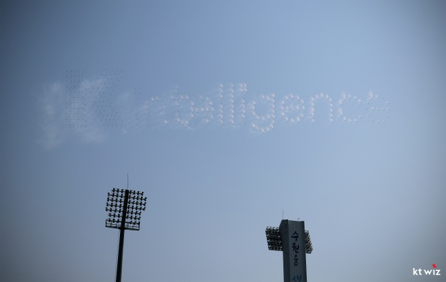 개막전 축사에 앞서 팬들이 제작한 AI 응원가를 활용한 그라운드 공연이 펼쳐졌다. 전광판으로 시구를 알리면서는 드론 350대가 폭 170m로 KT의 AI 브랜드인 K Intelligece를 하늘에 수놓는 퍼포먼스를 선보였다.