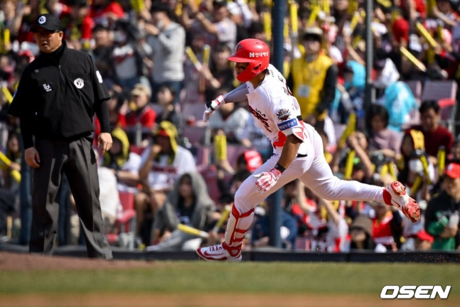 이어 KIA가 1-0으로 앞선 3회말 1사 주자 없는 상황. 김도영이 두 번째 타석에 들어섰다. 여기서 김도영은 로건을 상대로 볼카운트 0-2에서 3구째를 공략, 깨끗한 좌전 안타를 기록했다. 1루를 향해 질주한 김도영은 베이스를 밟은 뒤 2루를 노리면서 가는 듯하다가 다시 귀루했다.