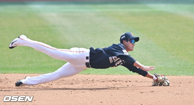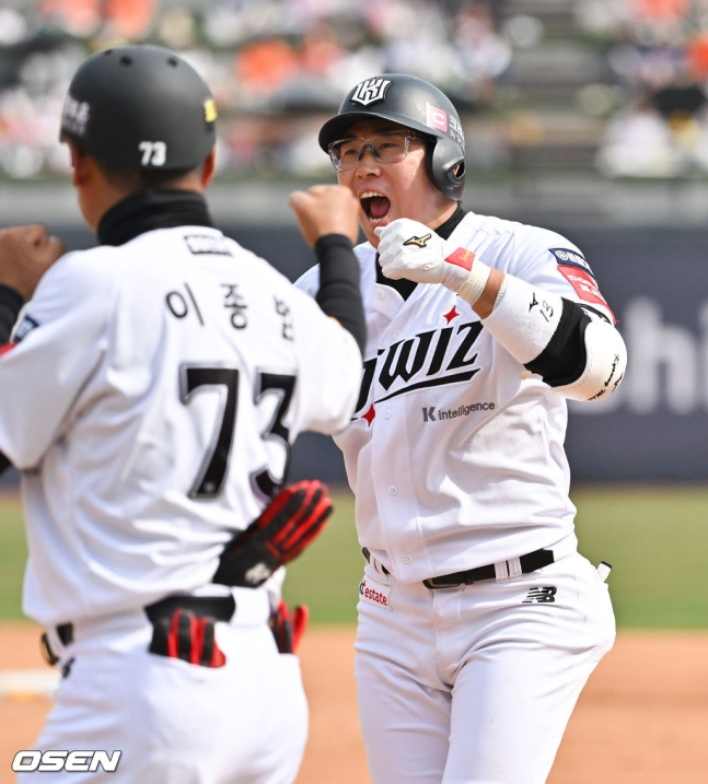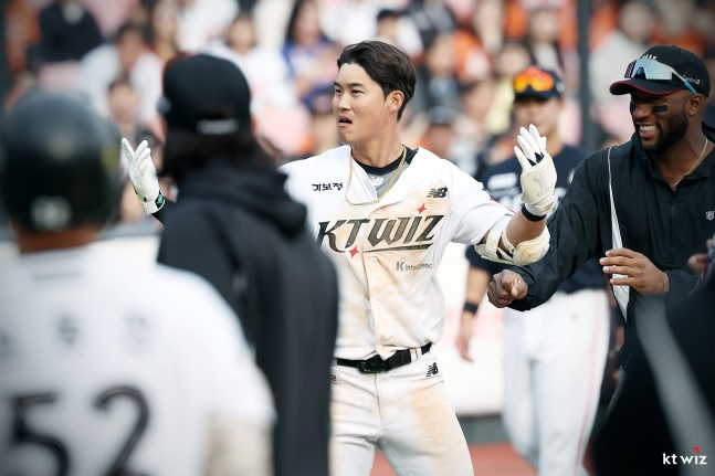하지만 KT에도 '끝내주는 남자' 배정대가 있었다. 연장 11회말 장성우의 볼넷 출루, 오윤석의 땅볼 타구, 천성호의 몸에 맞는 볼로 1사 1, 2루가 만들어졌다. 배정대는 좌중간 외야를 가르는 2루타를 때려내면서 팀에 첫 승을 안겼다.