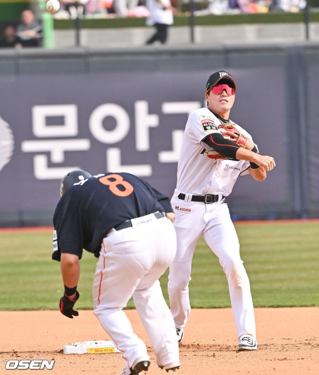 KT는 키스톤콤비의 좋은 수비로 계속해서 리드를 이어갔다. 한화가 6회초 노시환의 1타점 적시타로 3-4로 추격했으나, 채은성을 6-4-3 병살타로 돌려세웠다. 한화는 8회초 1사 1루로 한 번 더 기회를 잡았지만, 에스테반 플로리얼의 빠른 타구를 2루수 천성호가 환상적인 터닝 송구로 병살을 끌어냈다.