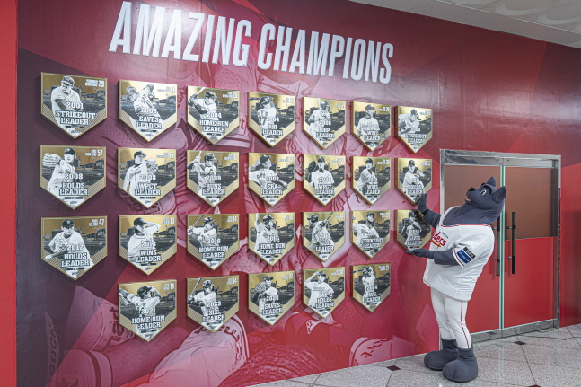 먼저 야구장 이곳저곳에 SSG의 발자취를 느낄 수 있는 공간이 조성됐다. 1층 스카이박스 엘리베이터 옆 의무실 벽면은 '어메이징 챔피언스 존'(Amazing Champions Zone)으로 꾸며졌다. 역대 개인 타이틀 홀더 선수들의 모습이 디자인 돼 명예의 전당으로 조성됐고 구단 헤리티지를 팬과 함께 공유하고 이를 기념하는 포토존이 될 전망이다.