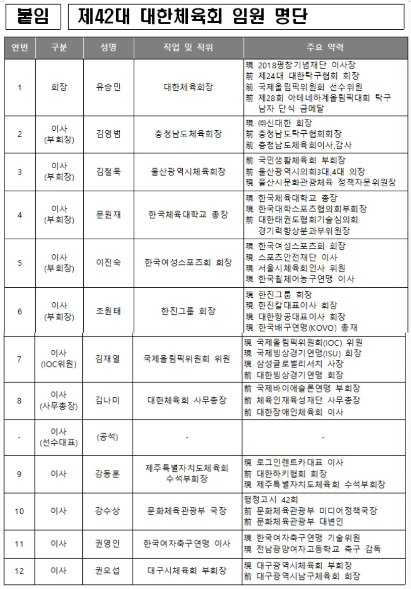 유승민 대한체육회장은 25일 새로운 부회장과 이사 등 제42대 집행부를 선임했다고 체육회가 밝혔다.