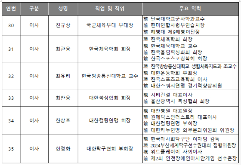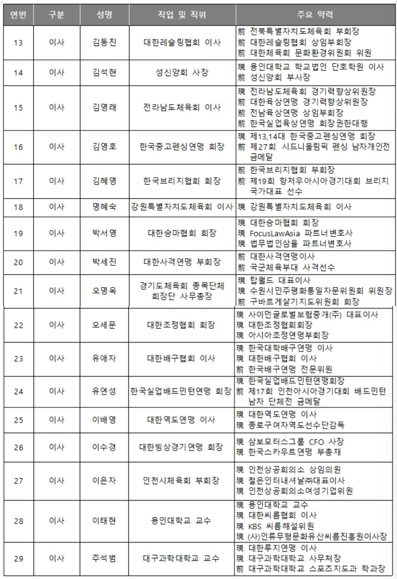 이사로는 올림픽 종목 대표 인사를 포함해 체육 분야별 전문가와 현장의 목소리를 대변할 수 있는 선수 및 지도자 출신 인사를 고르게 선임했다고 체육회는 전했다. 올림피언으로는 현정화와 김영호 이사를 비롯, 유애자(배구), 유연성(배드민턴), 이배영(역도) 이사가 참여하며, 지역의 현장 지도자부터 시도체육회장까지 지방체육 인사들도 다수 포함됐다.