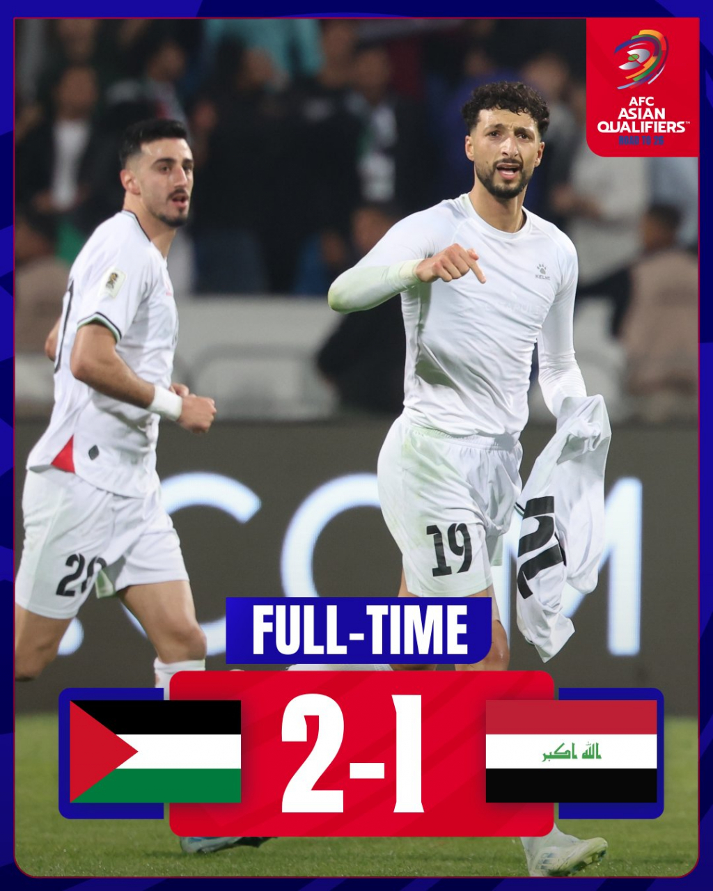 이라크는 26일(한국시간) 요르단 암만의 암만 인터내셔널 스타디움에서 열린 2026 국제축구연맹(FIFA) 북중미월드컵 아시아 지역 3차 예선 B조 8차전에서 팔레스타인에 1-2로 졌다.