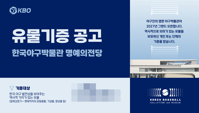 한편 KBO는 역사적으로 의미가 있는 야구 물품에 대한 기증을 지속적으로 받는다. 기증 대상은 한국 야구의 발전상을 보여주는 역사적 가치가 있는 유물이며, KBO 정책지원팀 박물관파트 아카이브센터로 전화 또는 이메일을 통해 신청 가능하다.