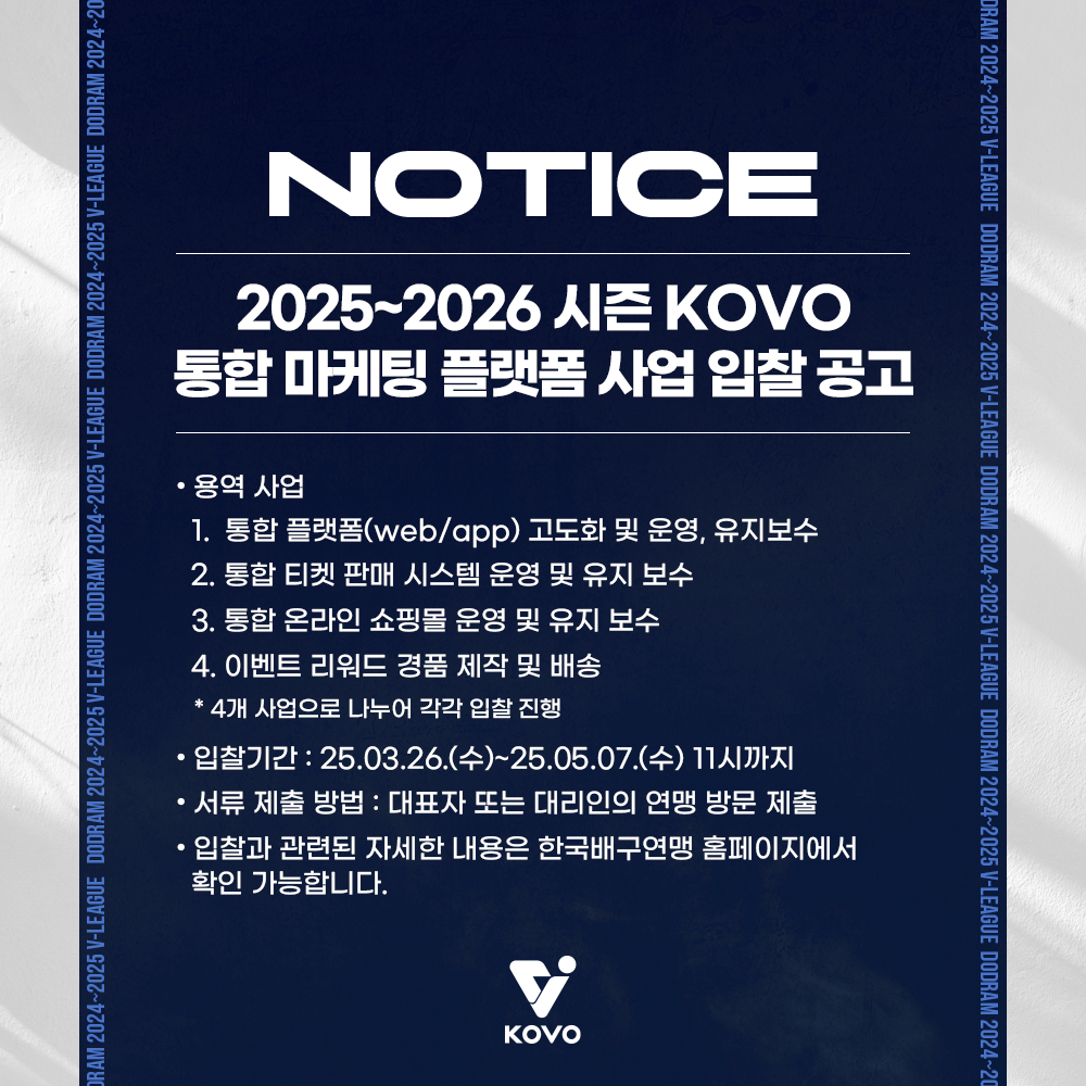 한국배구연맹이 2025~2026 시즌 KOVO 통합 플랫폼 사업 운영을 위한 용역 업체를 모집한다.