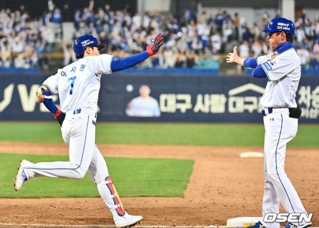 동점 이상 만들지 못하던 삼성은 5회 들어 처음으로 리드를 잡았다. NC 2번째 투수 김민규를 상대로 첫 타자 이재현이 2루타로 포문을 연 후 1사 3루에서 김영웅의 좌익수 플라이를 날렸다. 다소 짧을 수도 있었으나, 이재현이 홈으로 들어오면서 삼성은 5-4로 앞서나갔다.