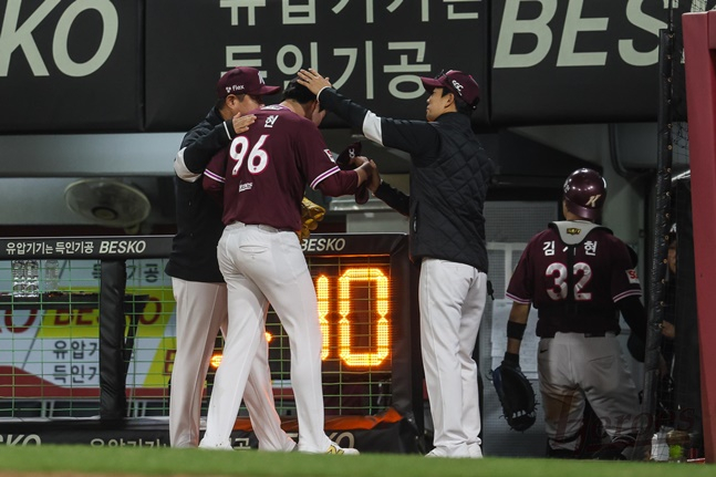 선배들은 신인의 씩씩한 투구에 호수비로 힘을 보탰다. 중견수 이주형은 연이은 슈퍼캐치로 윤현의 어깨를 가볍게 했다. 4회 돌연 흔들리며 연속 볼넷으로 시작하기도 했고 몸에 맞는 공까지 허용하며 2사 만루 위기에 몰렸다. 적시타를 맞았으나 이번엔 우익수 이형종의 완벽한 홈송구로 2루 주자를 홈에서 잡아내며 위기에서 벗어났다.