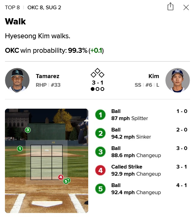 여기서 끝이 아니었다. 8회초 1사에서 김혜성은 물오른 선구안으로 탄착군이 형성된 미샐 타마레즈의 공을 모두 골라내고 볼넷으로 1루에 진루, 3출루 경기를 완성했다.