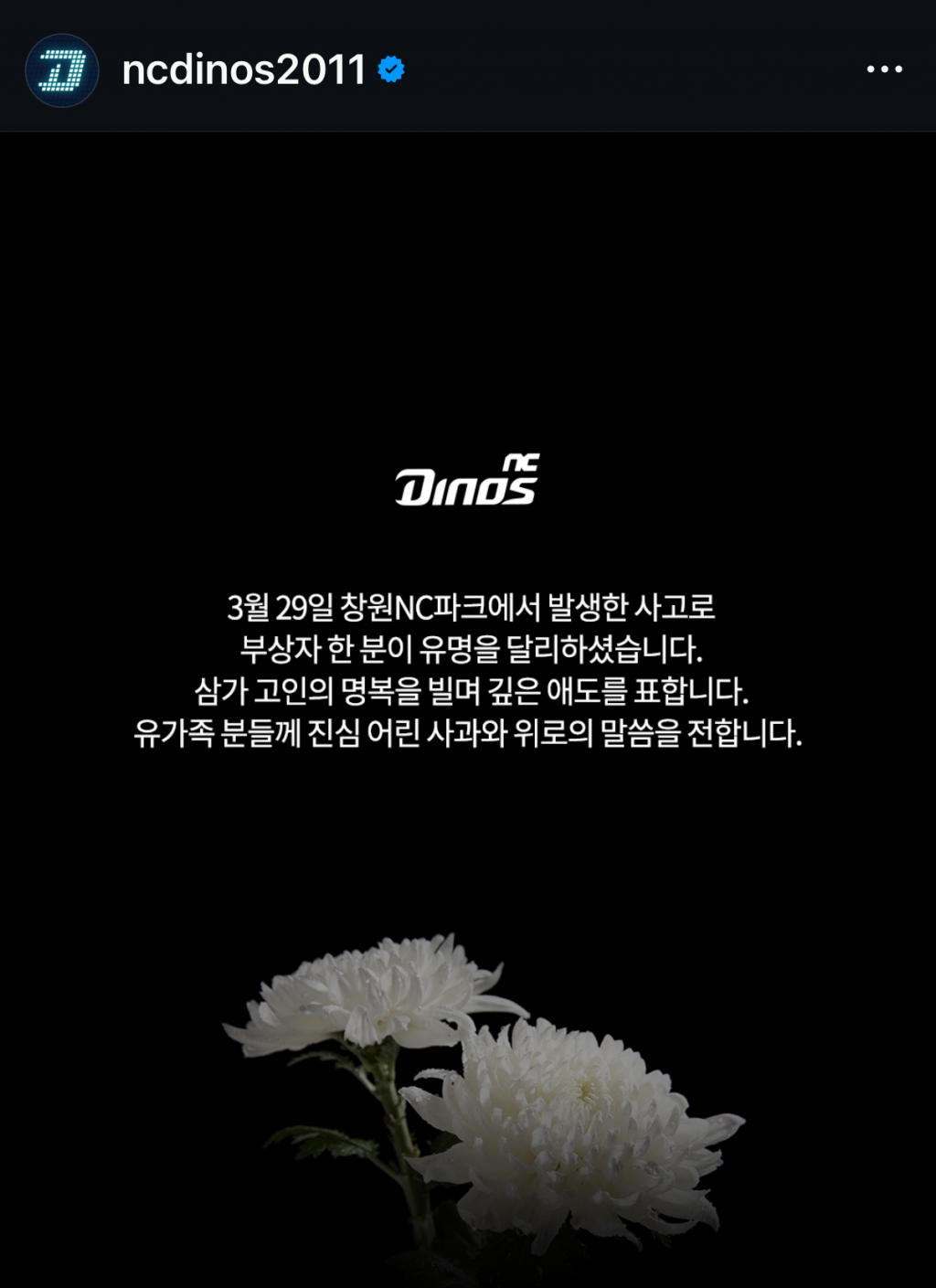 NC 다이노스는 31일 구단 공식 SNS(소셜네트워크서비스) 채널을 통해 "3월 29일 창원 NC파크에서 발생한 사고로 부상자 한 분이 유명을 달리하셨습니다. 삼가 고인의 명복을 빌며 깊은 애도를 표합니다. 유가족 분들께 진심 어린 사과와 위로의 말씀을 전합니다"라고 밝혔다.