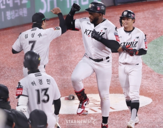 KT는 2일 수원KT위즈파크에서 열린 LG와 2025 신한 SOL Bank KBO 리그 정규시즌 홈 경기서 9-5로 이겼다. 9-1까지 달아난 뒤 LG의 추격을 뿌리쳤다.