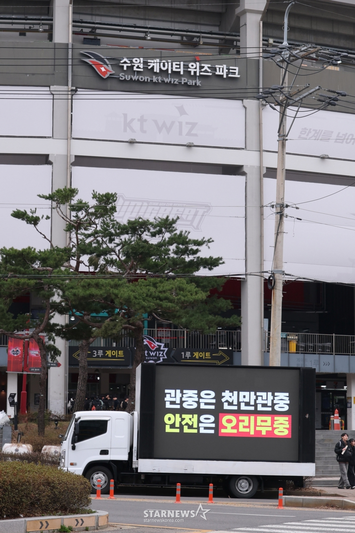 스포츠야구[포토] 천만관중의 안전은 오리무중발행 : 2025.04.02 ・ 16:11수원=김진경 대기자2025 신한 SOL Bank KBO리그 kt 위즈 대 LG 트윈스 경기가 2일 수원KT위즈파크에서 열렸다.창원 NC파크에서 발생한 사고와 관련, KBO의 안전불감즘을 지적하는 시위 트럭이 수원KT위즈파크 사거리에서 팬들에 호소하고 있다.<저작권자 © 스타뉴스, 무단전재 및 재배포 금지>창원_사고희생자NC파크야구프로야구KBO추천 기사김진경 대기자기자홈좋아요 스포츠-야구의 인기 급상승 뉴스스포츠-야구의 최신 뉴스