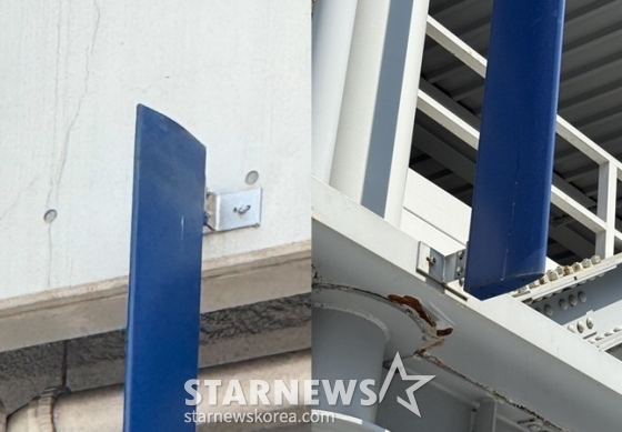 만약 떨어진다면 더 아찔한 상황을 초래할 수 있는 위치다. 주차장 바로 옆에는 인도가 있고, 약 5m 정도인 루버의 길이를 생각하면 자칫 튕겨나갈 경우 차도까지도 덮칠 수 있을 것으로 보였다. 이번 사고를 일으킨 야구장 외벽 루버의 길이는 2.6m였다.