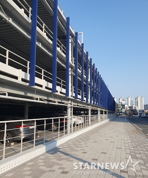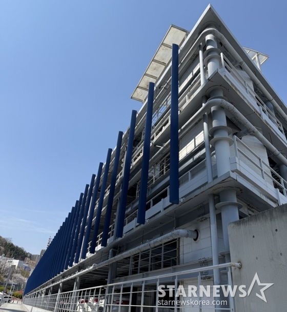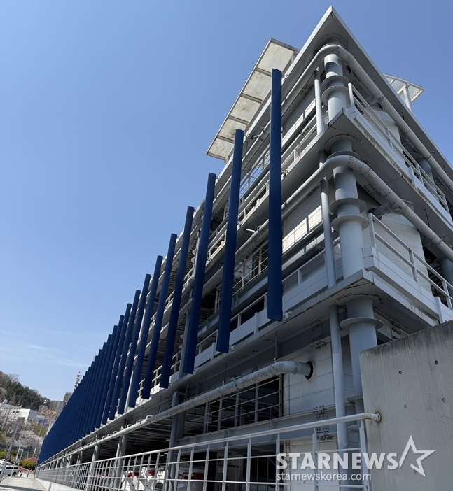 2일 스타뉴스가 찾은 이 주차장에는 2층에서 4층에 걸쳐 파란색의 외부 구조물이 수십 개 설치돼 있었다. NC 2군 구장인 마산야구장 쪽으로 67개, 인조잔디구장 쪽으로는 15개 등 총 82개였다. 이는 최근 논란이 된 창원NC파크의 알루미늄 루버와 동일한 형태로 달려 있었다.