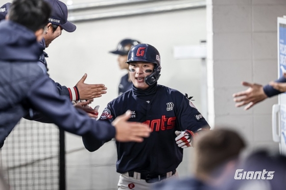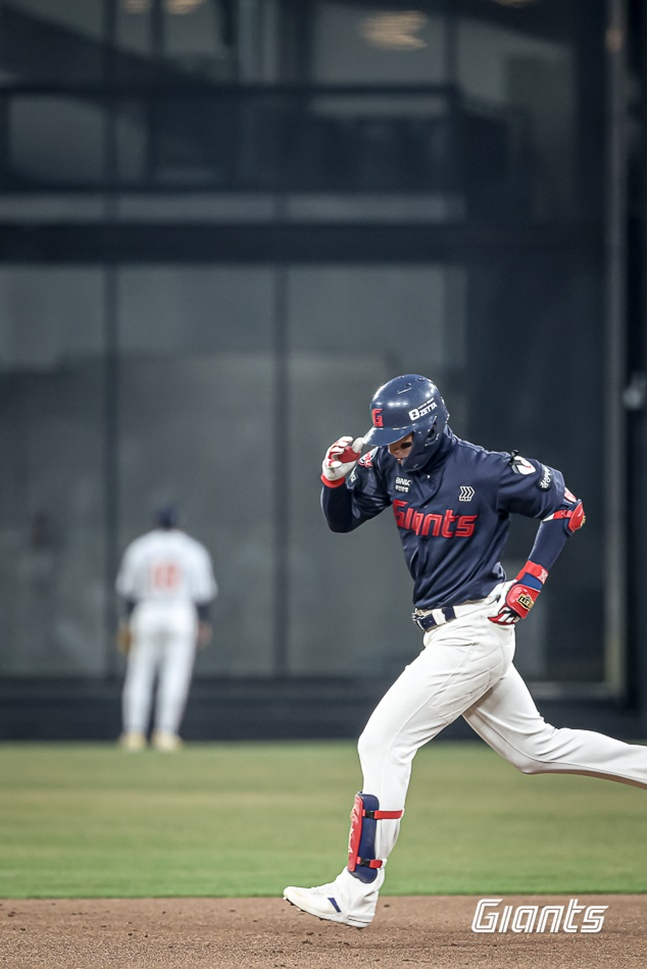 밀어친 타구는 오른쪽으로 날아갔고, 우측 펜스를 살짝 넘어가는 비거리 115m의 솔로홈런이 됐다. 윤동희의 시즌 마수걸이 홈런이었다. 넘어갈 줄 몰랐던 듯 1루로 달려나간 그는 홈런이 나온 후에도 덤덤한 표정으로 다이아몬드를 돌았다.