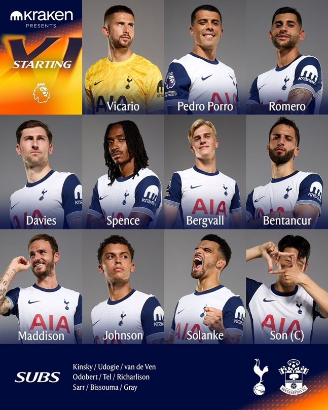 경기를 앞두고 토트넘은 선발 라인업을 공개했다. 손흥민이 주장 완장을 착용하고, 도미니크 솔랑케, 제임스 메디슨, 브레넌 존슨, 로드리구 벤탄쿠르, 루카스 베리발, 디옵 스펜서, 크리스티안 로메로, 페르로 포로, 굴리엘모 비카리오 골키퍼가 선발로 나선다.
