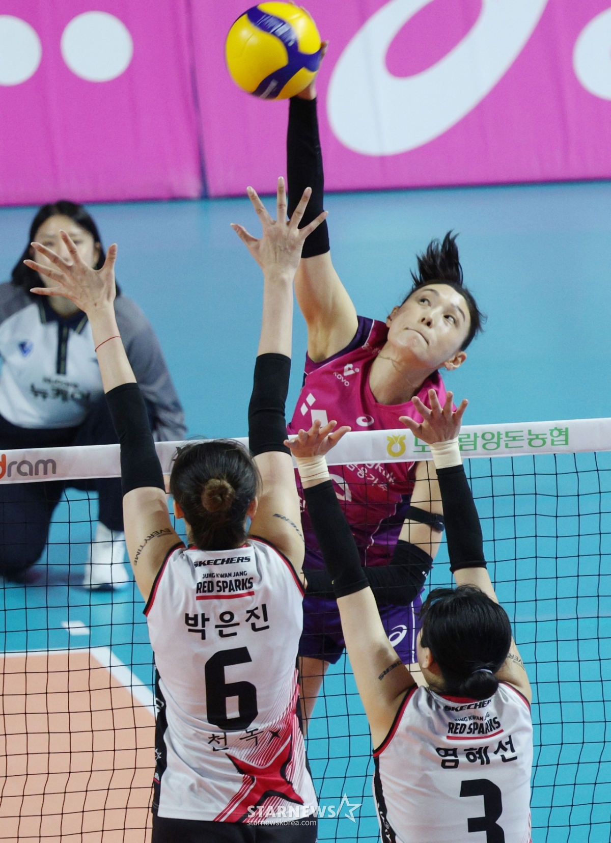 스포츠일반[포토] 김연경 '오늘은 날 못 막아'발행 : 2025.04.08 ・ 19:49인천=김진경 대기자'도드람 2024~2025 V리그' 여자부 챔피언결정전 5차전 흥국생명 대 정관장 경기가 8일 인천 삼산월드체육관에서 열렸다.흥국생명 김연경이 정관장 박은진, 염혜선의 더블 블로킹 위로 강스파이크를 날리고 있다.<저작권자 © 스타뉴스, 무단전재 및 재배포 금지>아본단자여자배구V리그김연경MVP고별전추천 기사김진경 대기자기자홈좋아요 스포츠-일반의 인기 급상승 뉴스스포츠-일반의 최신 뉴스