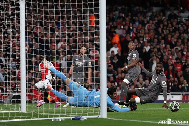 경기 초반 흐름은 아스널이 잡았다. 볼 점유율을 높여 레알 마드리드를 압박했다. 레알 마드리드는 발이 빠른 음바페와 비니시우스로 아스널의 뒷공간을 노렸다. 24분 역습 상황에서 음바페의 슈팅은 골문 위로 떴다.