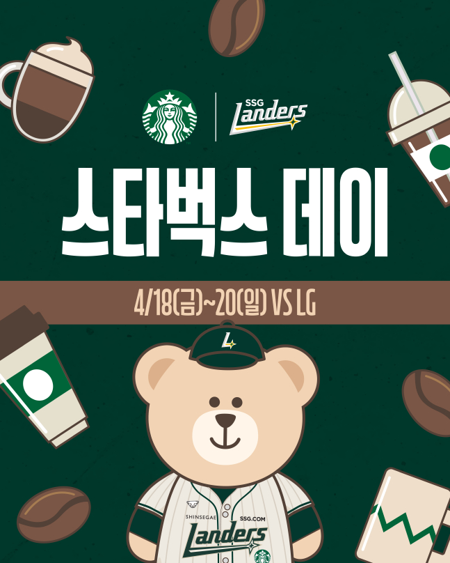 SSG 랜더스는 "18일부터 20일까지 인천SSG랜더스필드에서 열리는 LG트윈스와 주말 3연전을 맞아 스타벅스 코리아와 함께 '스타벅스 데이'를 실시한다"고 9일 밝혔다.