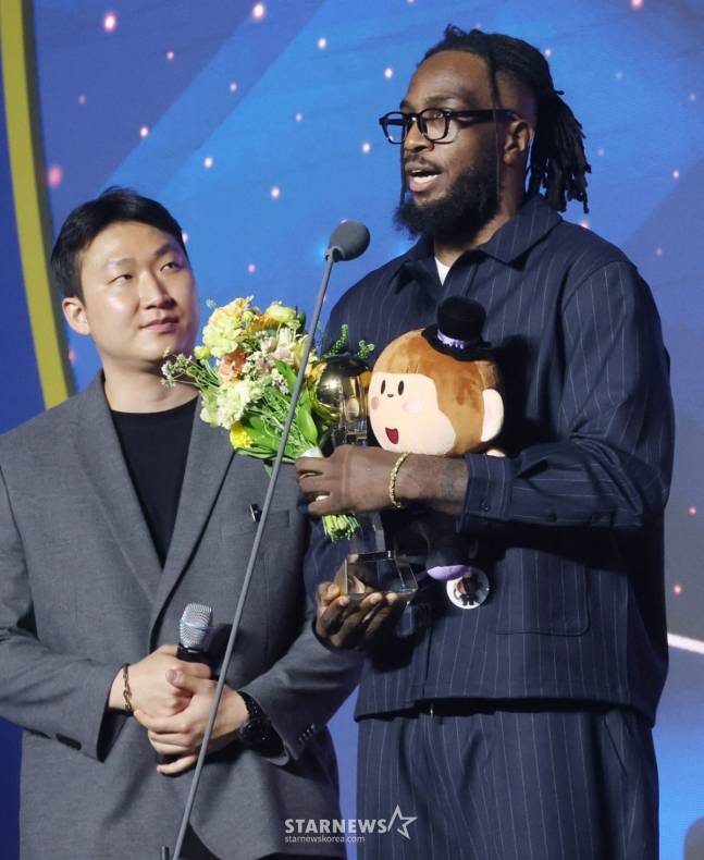 계량상에선 먼저 고양 소노의 에이스 이정현이 2년 연속 스틸상(평균 1.9개), 부산 KCC 외국선수 캐디 라렌(평균 1.2개)은 블록상을 거머쥐었다. 수원 KT 허훈은 4시즌 만에 어시스트 1위에 올랐다. 평균 6.2개. 허훈은 "제가 잘했다기보다는 팀원들이 잘해서 받을 수 있었다. 팀원들에게 맛있는 밥을 사겠다"고 말했다.