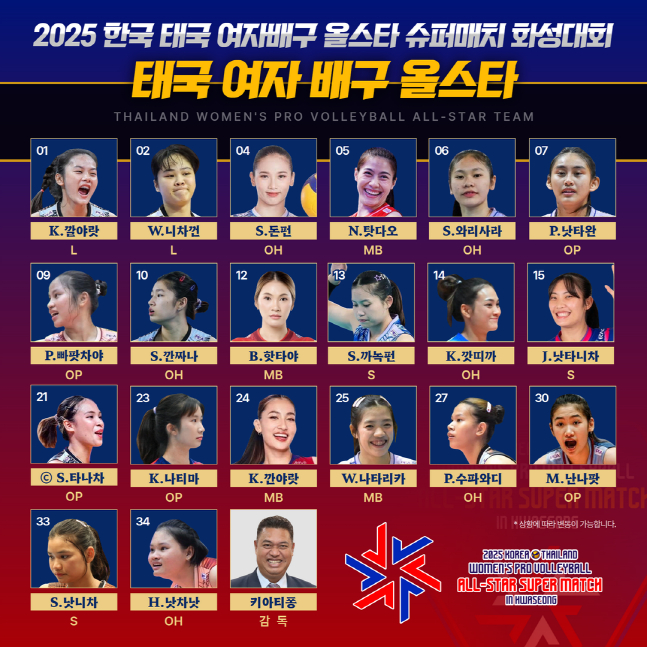 태국 올스타에는 한국도로공사에서 2시즌을 뛰었던 타나차 쑥솟을 비롯해 일본 PFU 블루캣츠 소속의 세터 낫타니차 짜이샌, 지난해 통영 KOVO컵으로 한국을 찾았던 아란마레 야마가타 소속의 아웃사이트 히터 돈펀 신포 등이 경기를 준비 중이다.
