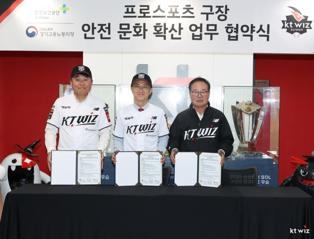 KT 구단은 "10일 수원KT위즈파크에서 열린 경기에 앞서 고용노동부 경기지청, 안전보건공단 경기지역본부와 안전 문화 확산 및 실천을 위한 업무 협약을 체결했다"고 11일 밝혔다.